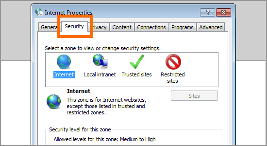 - The “Internet Properties” dialogue box will open. Inside it to navigate to the Security tab and look at the slider given there. If that slider is too high on the scale, bring it in the middle (to Medium level) and click OK.
