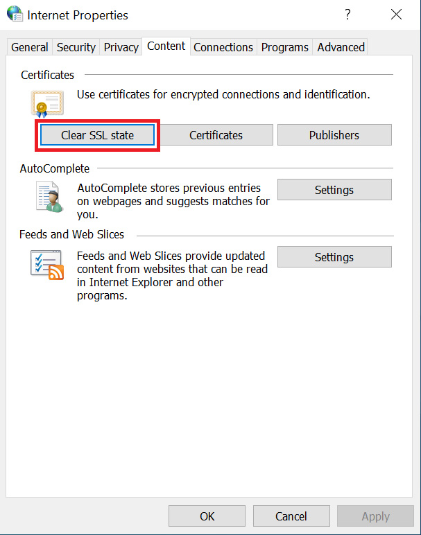 - Go to the Content window and click on the Clear SSL State Button