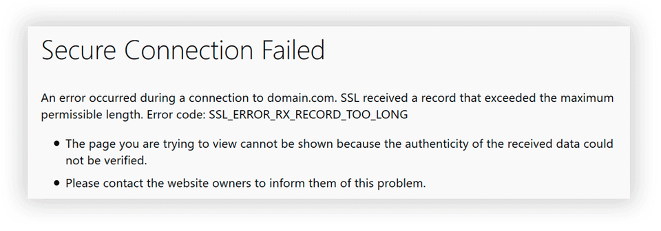 SSLERRORRXRECORDTOO_LONG is a Firefox error that will typically appear due to some manner of server-side misconfiguration. The good news is that fixing this issue usually won't be a huge time-sink on your end; the bad news is that oftentimes the end-user (i.e. website visitor) might not be able to fix the issue in the first place. Firefox users that would still like to give it their best shot and resolve this Firefox error if at all possible, however, do have a few options at their disposal.